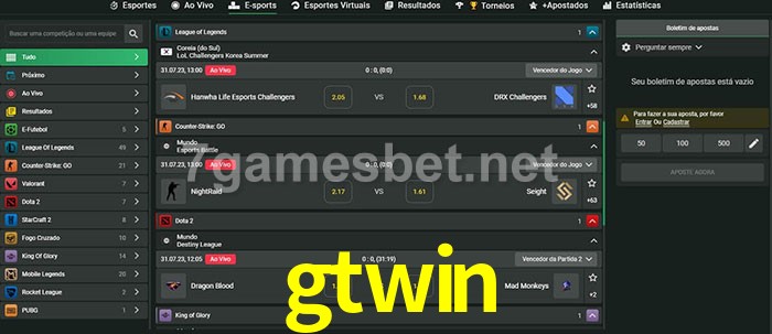 O gtwin oferece uma grande seleção de opções de apostas em e-sports com probabilidades competitivas